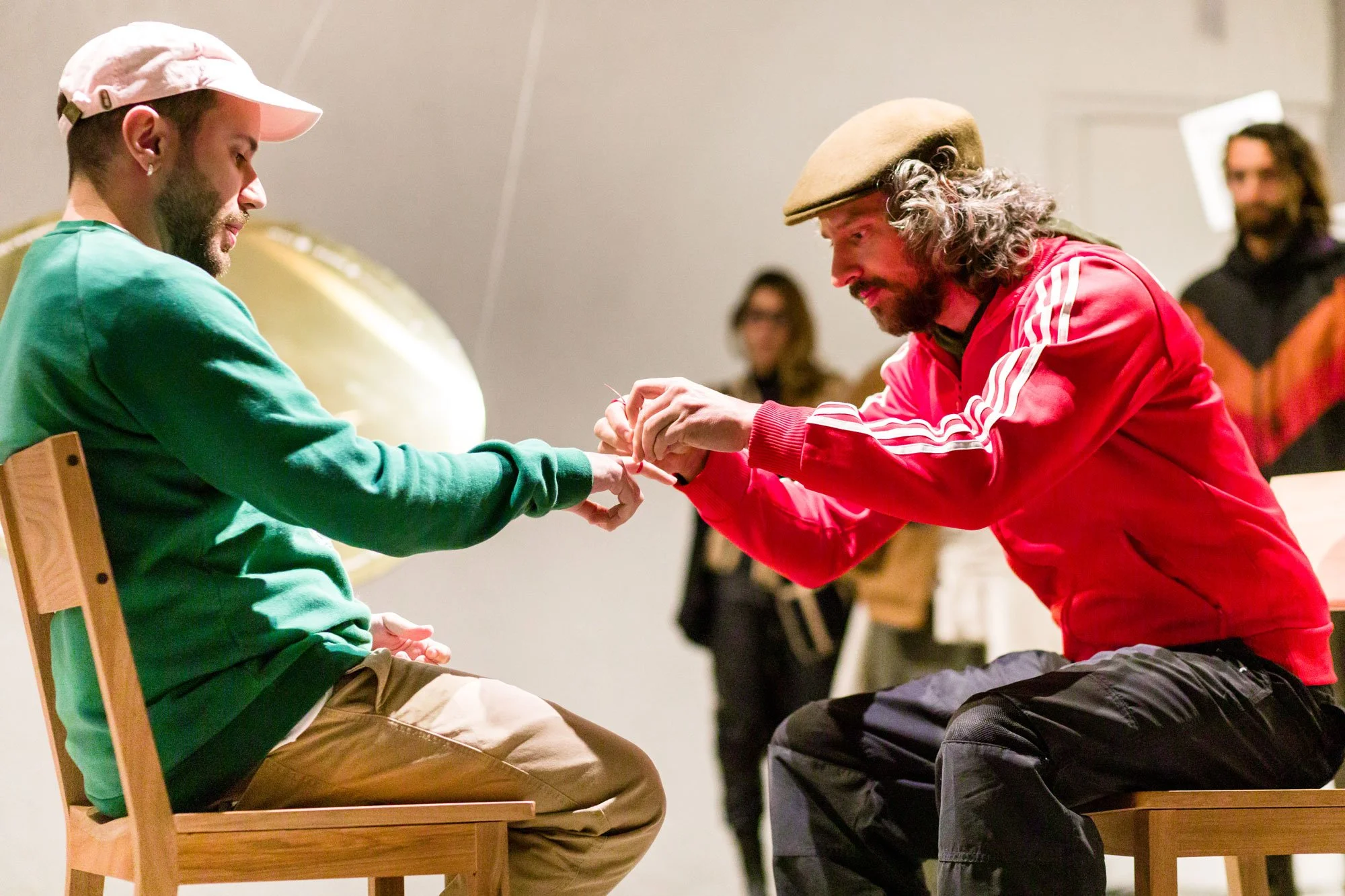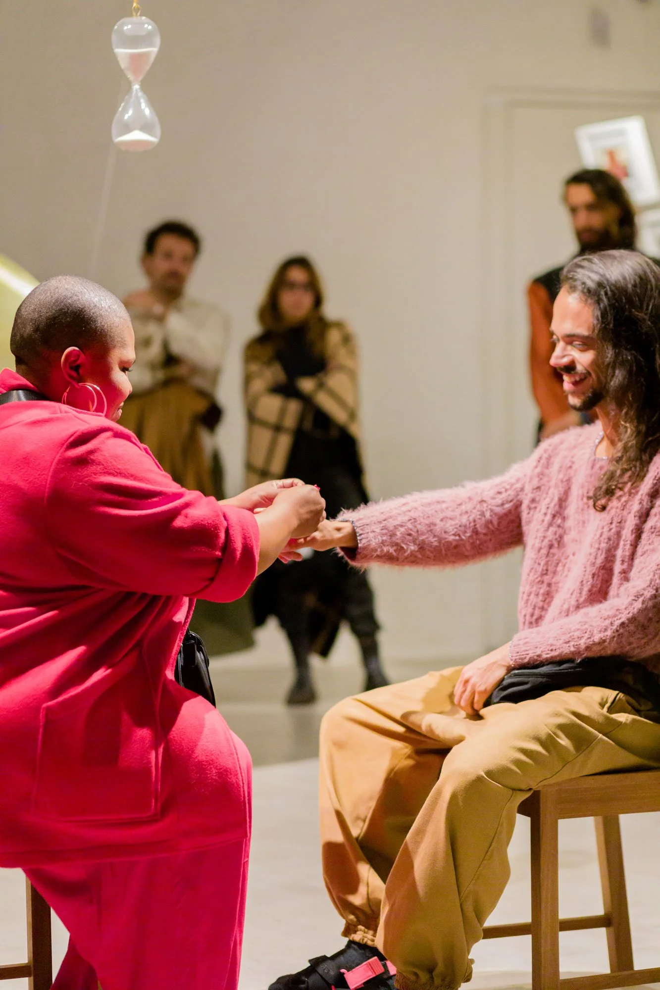 Around the hourglass, two simple chairs faced each other. The audience gathered standing and sitting around them, creating a silent circle of witnesses.